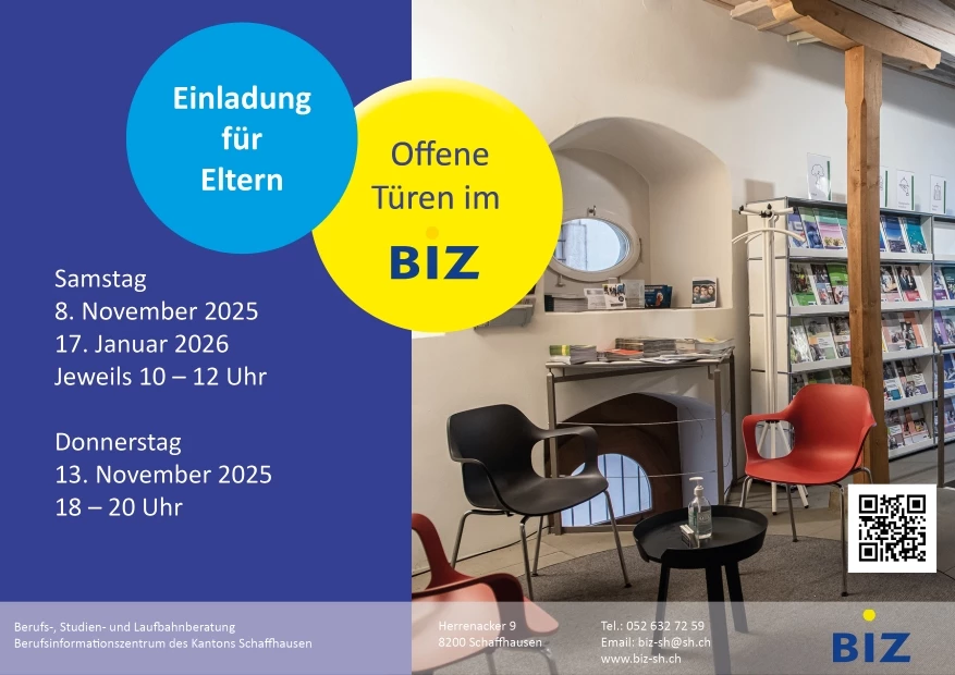Die Schaffhauser Berufsmesse bietet eine ideale Gelegenheit, Berufe hautnah kennen zu lernen. Über 50 Ausstellende präsentieren rund 150 verschiedene Berufe und weiterführende Schulen. Besuche uns am BIZ-Stand! Weitere Informationen unter berufsmesse-sh.ch.